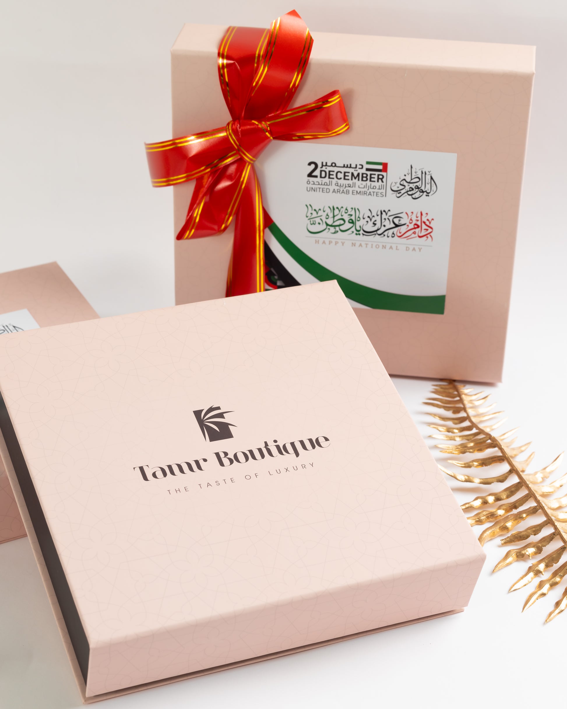 A selection of 36 pcs from our signature collection dates customized with a greeting card for the National Day,